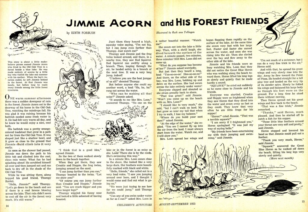 Howdy again, Readers! This time out we present “Jimmie Acorn Meets Mrs. Loon” from the August-Sept. 1953 issue of “Children’s Activities”. “Children’s Activities” was the predecessor of “Highlights” magazine, originating the “Hidden Pictures” and “Goofus and Gallant” features. CA’s version of “Goofus and Gallant” was “The Doings of Daffy and Dandy”. It’s interesting that women authors and artists were featured more than the men in “Children’s Activities”. I really like Ruth Van Tellingen’s drawings in the Jimmie series, and Edith Forbush must have been a naturalist. Her observations of animal behavior and descriptions of the characteristic markings on the birds’ feathers and animals’ bodies are very clearly expressed. These stories helped to expand outdoor encounters with wildlife for children, using anthropomorphism to add personality to the stories. Mrs. Loon and the Great Blue Heron are the featured birds in this story. Mrs. Loon is quite the show-off, and Croakie and Hoppie, the frog twins, are scared of the Great Blue Heron. Thumpy Rabbit wants to start a jumping contest with the frogs, which kicks the whole episode off. I hope you all are enjoying these classic tales. Happy Easter! from Mark and Itza.