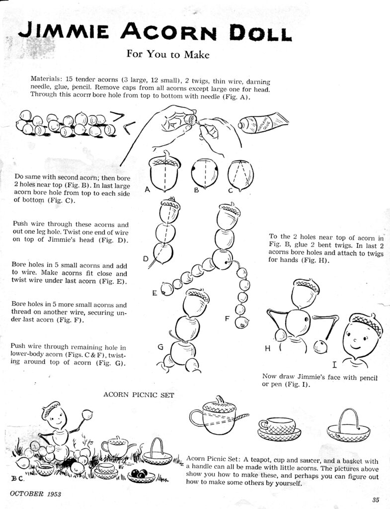 Childhood Nostalgia Edition # One.   Just for a change of content, here is an upload of material from my collection of vintage children’s magazine features that I enjoyed as a child in the late 1940s and early 1950s. “Jimmie Acorn” was a feature in “Children’s Activities” magazine, which was an “activity” magazine directed to children, full of things to make, puzzles and many charming stories. My favorite was Jimmie Acorn, a feature that encouraged wildlife studies and imbued the child reader with a love of the natural world. Jimmie was just a home made toy made of acorns that got left behind in the forest by the child that made him. Rather than falling apart, Jimmie came to life and made friends with diverse wildlife. In this story, which I call “Snapper the Turtle”, from April 1953, Jimmie Acorn helps Snapper catch flies for his meal. He also meets a Redwing Blackbird, a Kingfisher and old Grandpa Turtle. These stories were created by two women, Edith Forbush did the writing, and Ruth Van Tellingen made the drawings. I’ve also included a feature from the October, 1953 edition of “Children’s Activities” which shows how a Jimmie Acorn doll might be constructed. The crude crayon drawing at the top of the post was drawn by me with crayons on construction paper that is slowly chipping away. But my memories of Jimmie Acorn aren’t crumbling in to the woods, I still remember his sweet outgoing nature, and how all of the forest animals and birds befriended him. Features like this created a lifelong love of animals, I used to visit the Missouri Conservation Commission to see their small collection of animals, such as a red fox kept in a pen, lizards and snakes and of course a skunk! I had a subscription to “Missouri Conservationist” magazine, which was filled with wildlife photos and lore and featured their cartoon mascot: “Consy Coon”. Enjoy this cherished memory of a long-ago Missouri childhood. I’ll post more Jimmie stories soon.