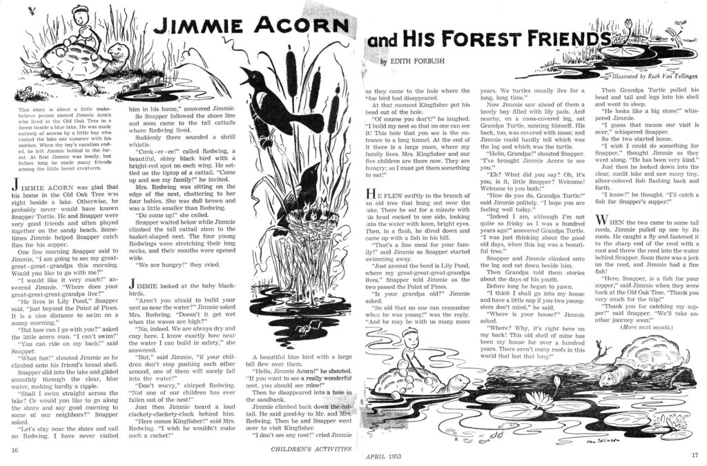 Childhood Nostalgia Edition # One.   Just for a change of content, here is an upload of material from my collection of vintage children’s magazine features that I enjoyed as a child in the late 1940s and early 1950s. “Jimmie Acorn” was a feature in “Children’s Activities” magazine, which was an “activity” magazine directed to children, full of things to make, puzzles and many charming stories. My favorite was Jimmie Acorn, a feature that encouraged wildlife studies and imbued the child reader with a love of the natural world. Jimmie was just a home made toy made of acorns that got left behind in the forest by the child that made him. Rather than falling apart, Jimmie came to life and made friends with diverse wildlife. In this story, which I call “Snapper the Turtle”, from April 1953, Jimmie Acorn helps Snapper catch flies for his meal. He also meets a Redwing Blackbird, a Kingfisher and old Grandpa Turtle. These stories were created by two women, Edith Forbush did the writing, and Ruth Van Tellingen made the drawings. I’ve also included a feature from the October, 1953 edition of “Children’s Activities” which shows how a Jimmie Acorn doll might be constructed. The crude crayon drawing at the top of the post was drawn by me with crayons on construction paper that is slowly chipping away. But my memories of Jimmie Acorn aren’t crumbling in to the woods, I still remember his sweet outgoing nature, and how all of the forest animals and birds befriended him. Features like this created a lifelong love of animals, I used to visit the Missouri Conservation Commission to see their small collection of animals, such as a red fox kept in a pen, lizards and snakes and of course a skunk! I had a subscription to “Missouri Conservationist” magazine, which was filled with wildlife photos and lore and featured their cartoon mascot: “Consy Coon”. Enjoy this cherished memory of a long-ago Missouri childhood. I’ll post more Jimmie stories soon.